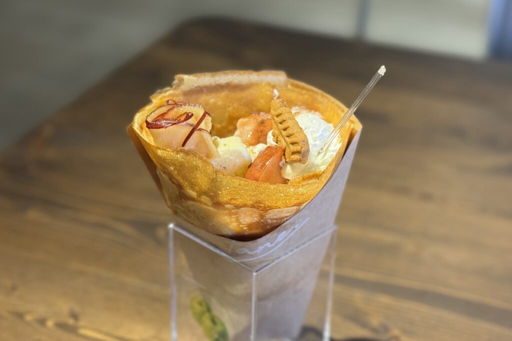 生地は米粉を使用しており周りはパリッと中はしっとり食感。クリームやアイスは優しい甘さでりんごの甘みがしっかり引き立っています。クッキーのザクっと食感もいいアクセントになって美味しい。