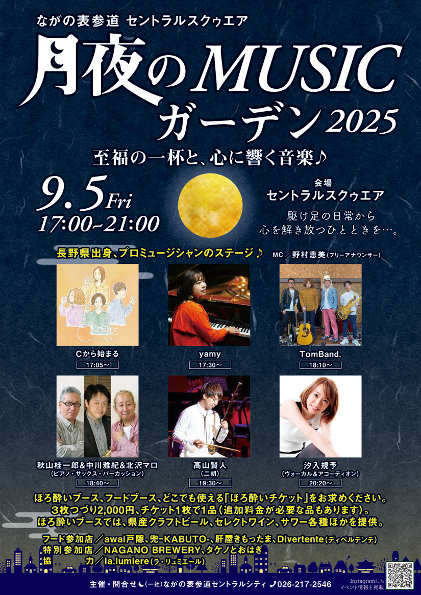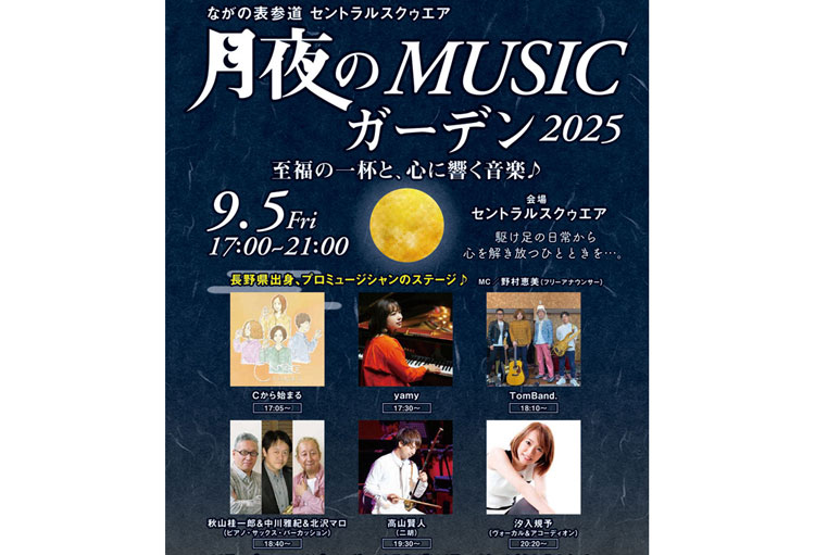長野県長野市の善光寺表参道沿いにある「セントラルスクゥエア」で、今年もナイトイベント『月夜のMUSICガーデン~至福の一杯と、心に響く音楽を♪』が、2025年9月5日(金)に開催。