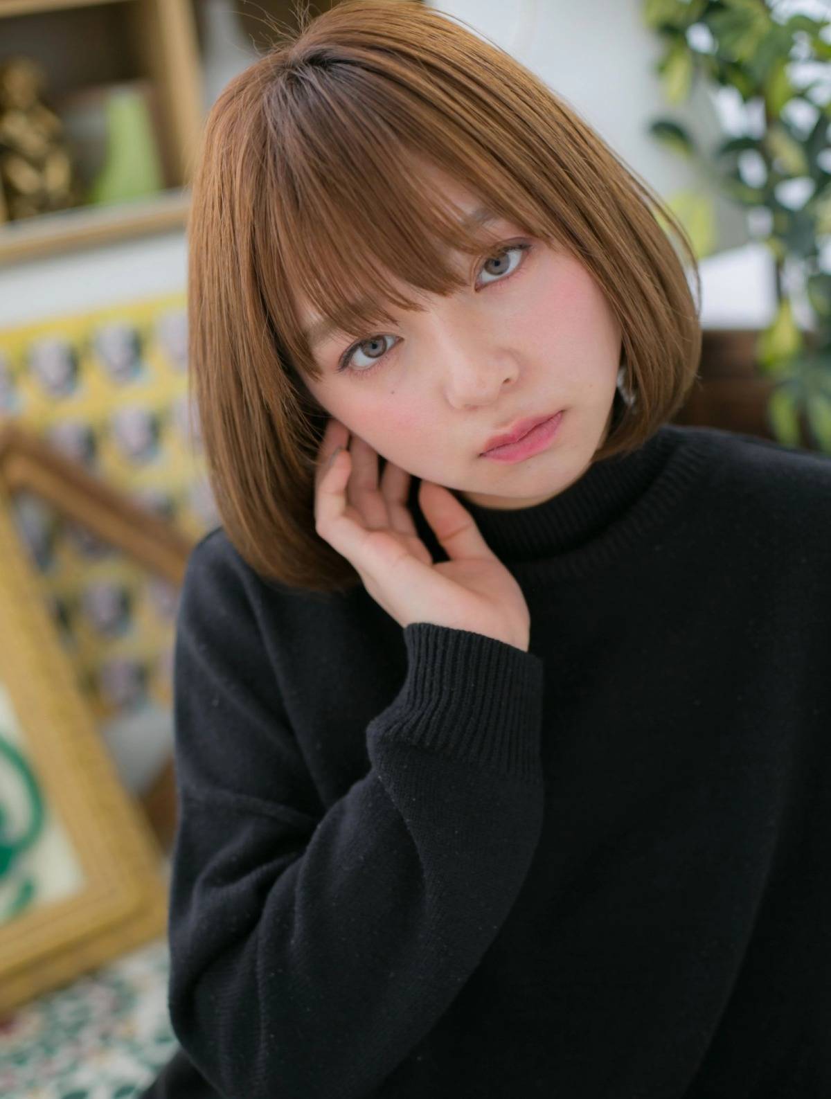 お肌に血色感をプラスできるピンクブラウンカラーのボブは、若見えするスタイルです。