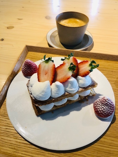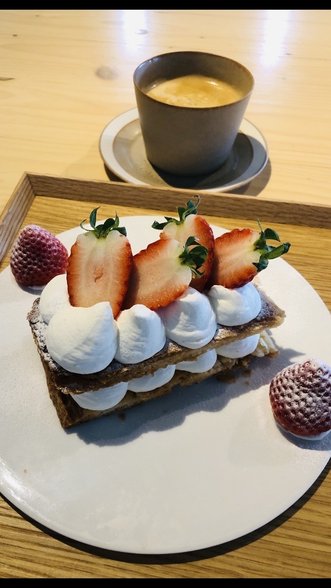 そのパイ生地に、ふわっとした生クリームとイチゴをのせていただきました。