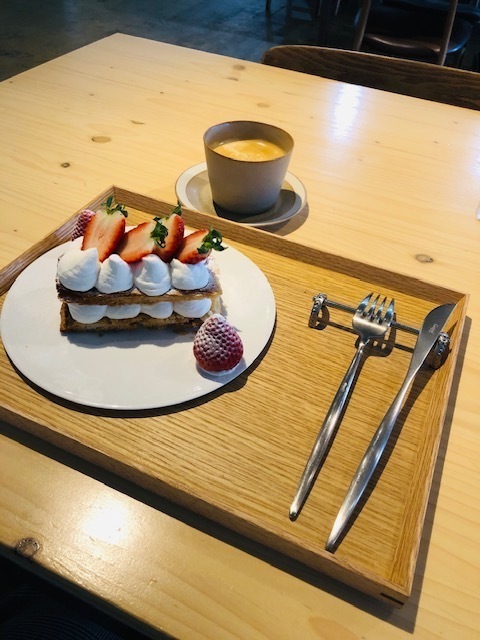 ガレットと迷いましたが、作りたてミルフィーユ(1,500円)にしました。シンプルで長めのカトラリーがお洒落です。