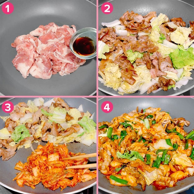 ③ ②をフライパンの端に寄せ、キムチの水分を飛ばすように炒める。
