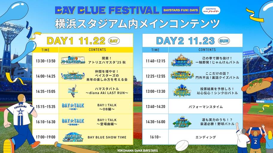 横浜 DeNA ベイスターズは、11 月 22 日(土)および 23 日(祝・日)の 2 日間にわたり実施する新イベント『横浜 DeNA ベイスターズ BAY BLUE FESTIVAL 〜 BAYSTARS FUN! DAYS 〜 Supported by ありあけハーバー』初日(DAY1)に実施する音楽ライブ「BAY BLUE SHOW TIME」のゲストとして、BAAD、けんいち、FIELD OF VIEW の出演を発表した。