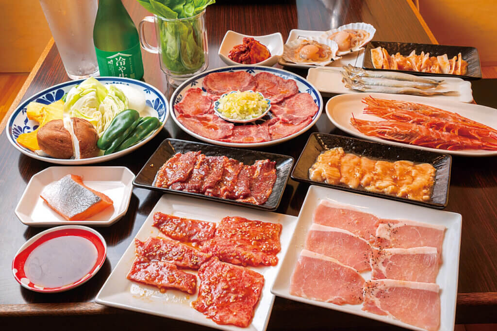 上カルビ(1,490円)からタン塩(1,290円)、エビ焼き(490円)、殻付きホタテ(390円)まで多彩なメニューを味わえます。