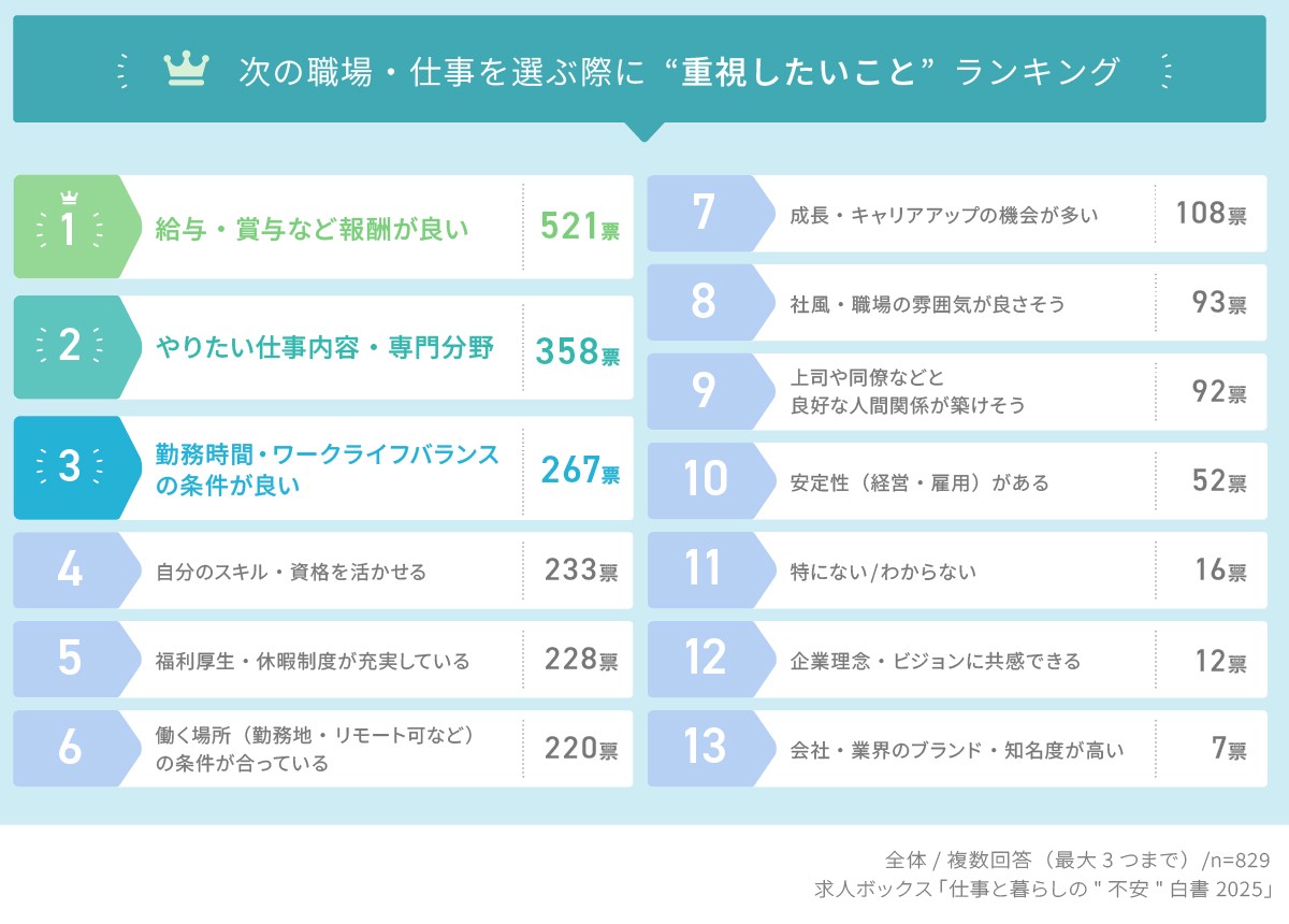 「次の仕事や会社を選ぶ際に重視する点」については、 「給与・賞与など報酬が良い」 (521票)が最多で、他の項目を大きく引き離した。「今の仕事を選んだ理由」では5位にとどまっていた一方で、「現職で不満を感じる点」では1位となっており、 報酬面への意識の高まり が明確に表れている。