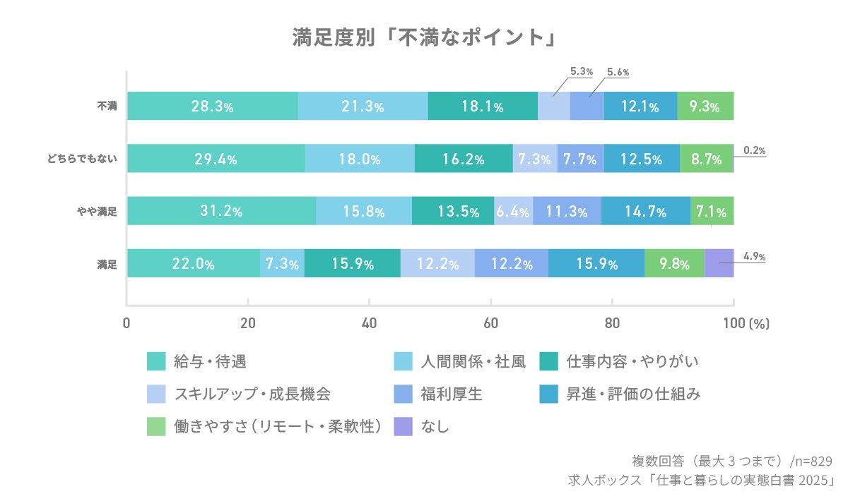 同様に、「仕事内容・やりがい」も「満足」(15.9%)から「不満」(18.1%)へ上昇しており、 人間関係とやりがいの欠如が不満層の離職リスクを高めている と言える。