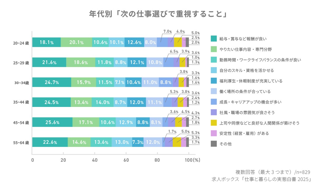 一方、若年層では 「やりたい仕事内容・専門分野」 が高く、「20〜24歳」(20.1%)は1位となった。キャリアの初期段階においては、 報酬よりも“自己実現”や“成長実感”を優先する姿勢 が明確である。