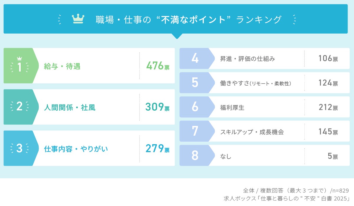 「職場・仕事のどの点に不満を感じているか」では、「給与・待遇」(476票)が群を抜いて1位だった。次いで、「人間関係・社風」(309票)、「仕事内容・やりがい」(279票)が上位に挙がった。
