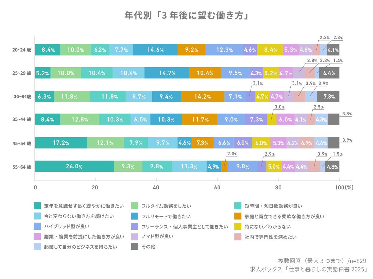 世代別には、シニアは「長く穏やかに働きたい」、中堅は「両立」、若手は「自由と柔軟性」を重視しており、働き方の価値観は多様化している。