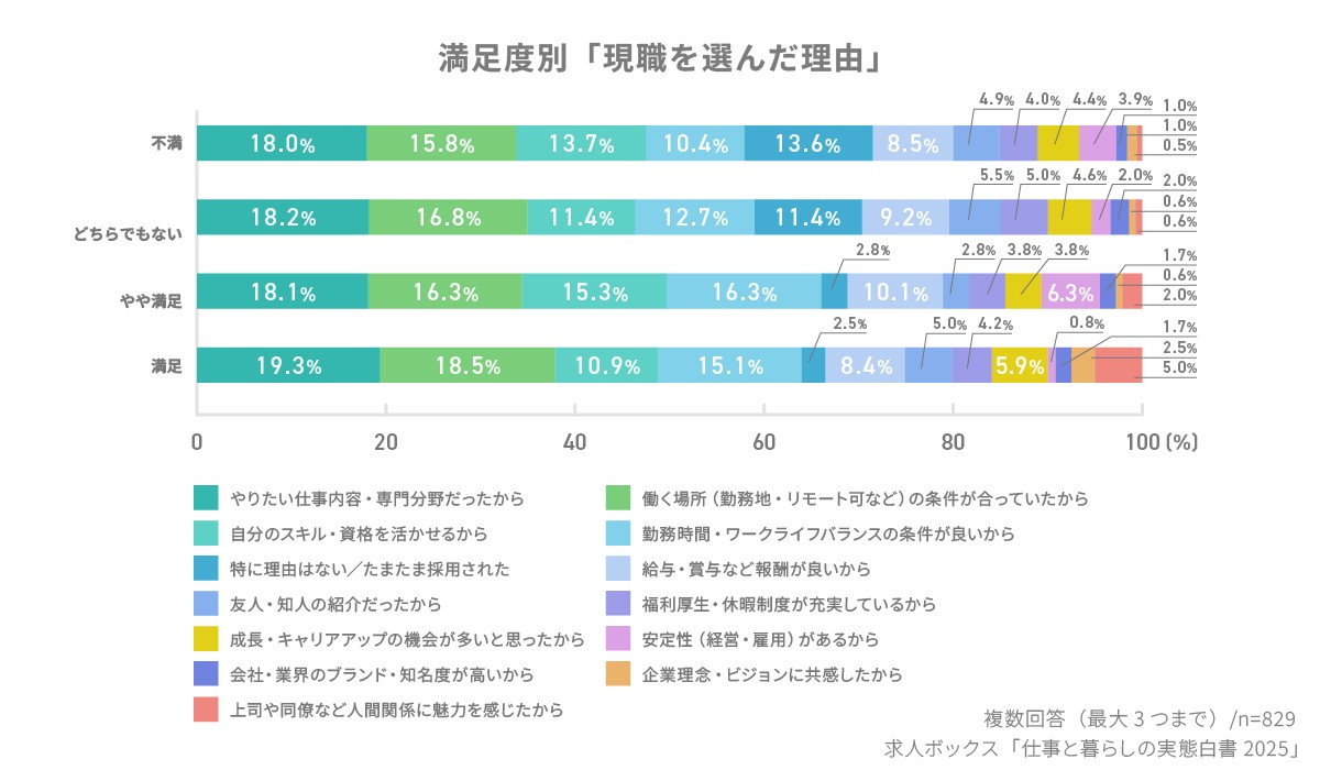 つまり、「今の仕事に満足している人」は、単に待遇や条件が良いからではなく、 自分の希望に沿った職場選びができたかどうかが満足度を大きく左右する ということが分かる。