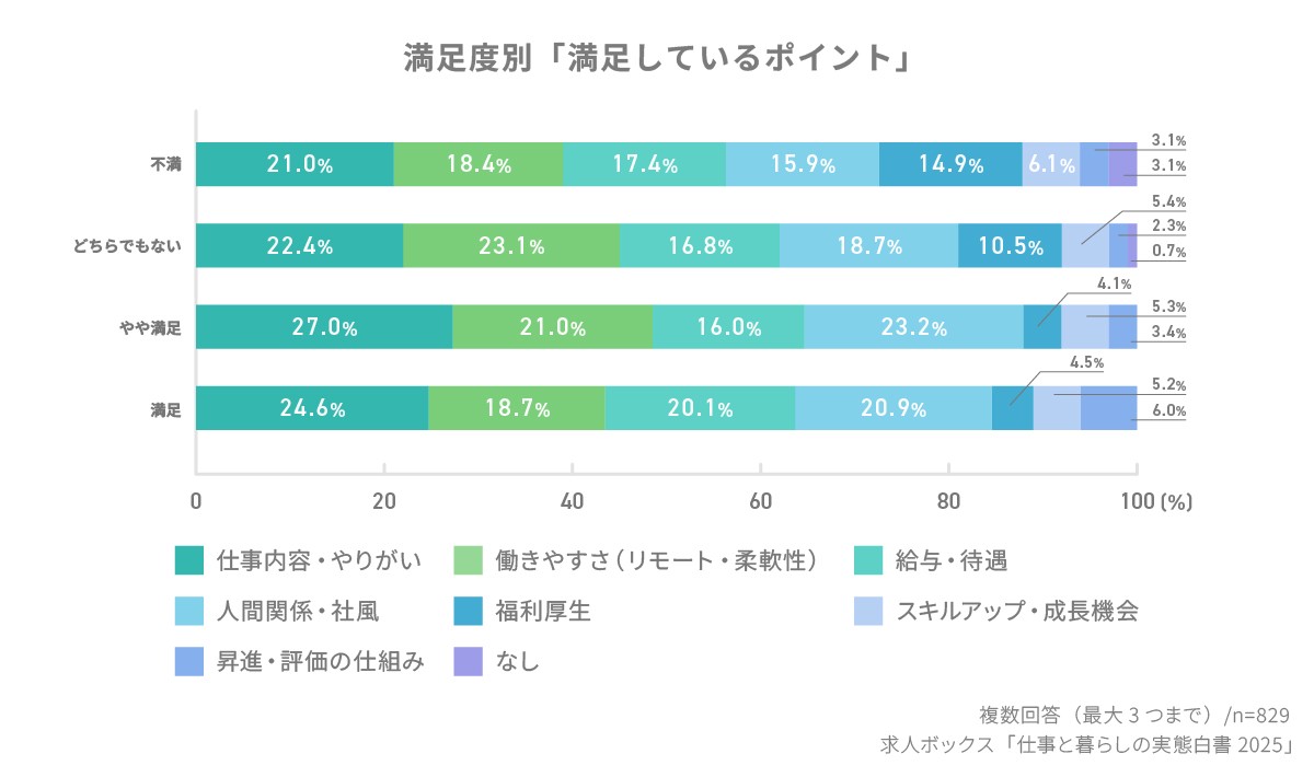 さらに、「人間関係・社風」「働きやすさ(リモート・柔軟性)」が続き、 心理的安全性と快適な職場環境が満足度を支えている ことがうかがえる。