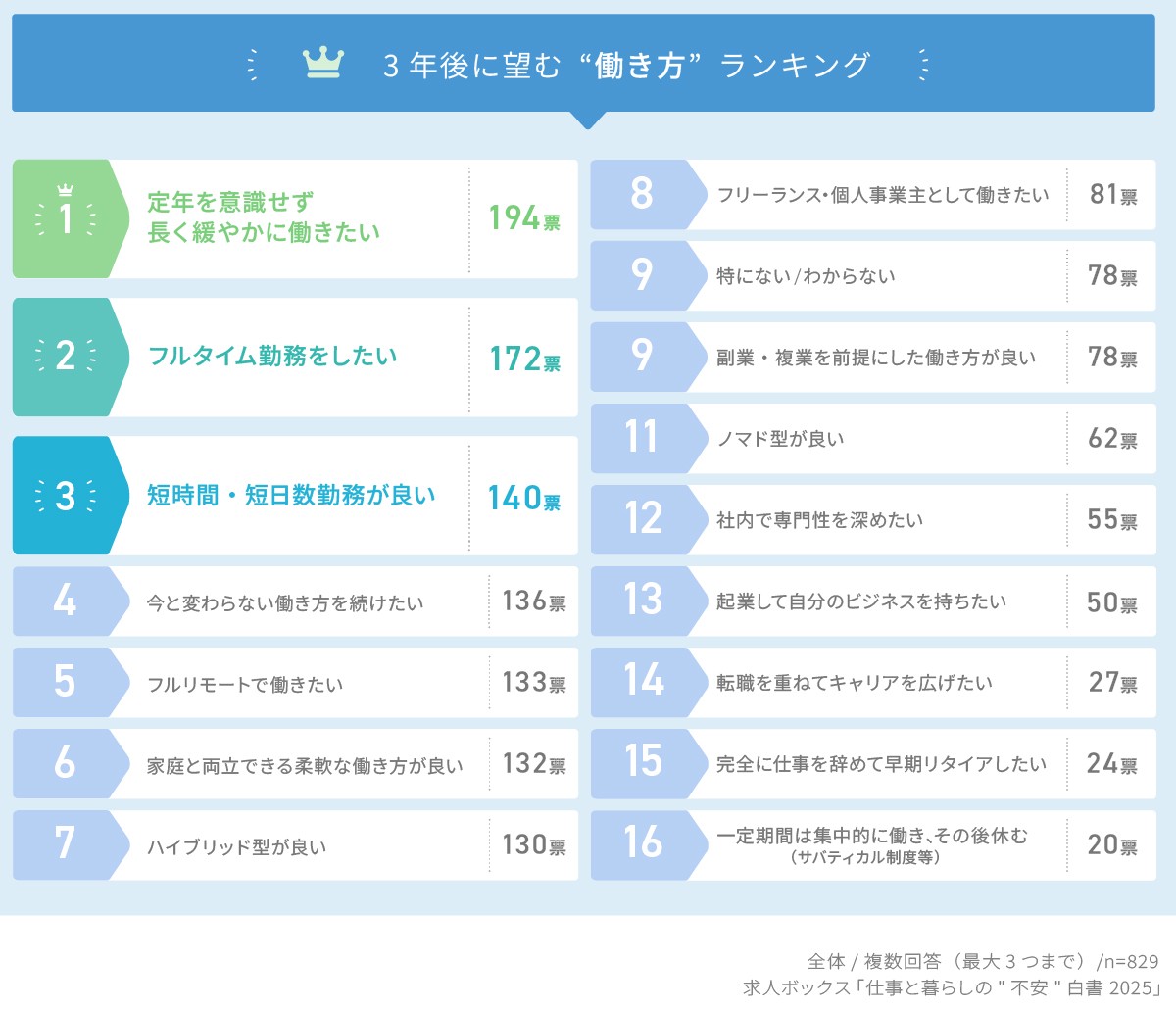 3年後の働き方としては、「定年を意識せず長く緩やかに働きたい」(194票)、「フルタイム勤務」(172票)が多く、続いて「短時間・短日数勤務」「フルリモート勤務」「家庭・子育て・介護との両立」などが上位に挙がった。