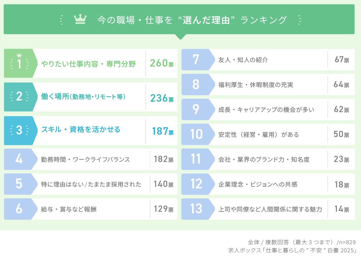 「今の仕事を選んだ理由」では、「やりたい仕事内容・専門分野だったから」(260票)が最も多く、次いで「勤務地・リモート可など条件が合っていた」(236票)、「スキル・資格を活かせる」(187票)が続いた。