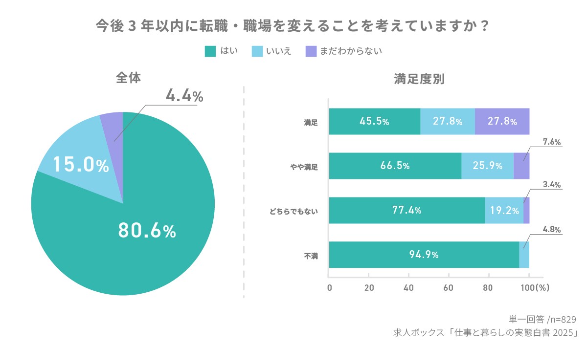 今後3年以内に転職・職場を変えることを考えている人は、全体の8割にのぼった。