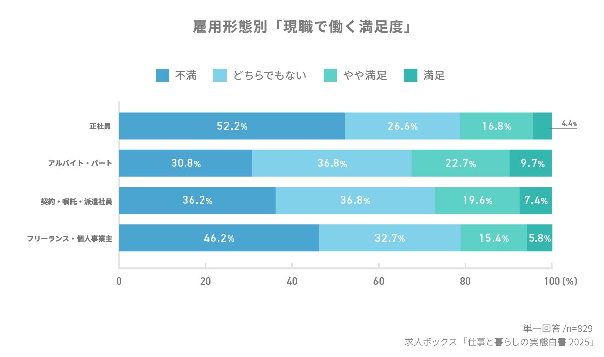 雇用形態別に見ると、 正社員は「不満」が52.2% と半数を占め、「満足層」(21.2%)を大きく上回った。