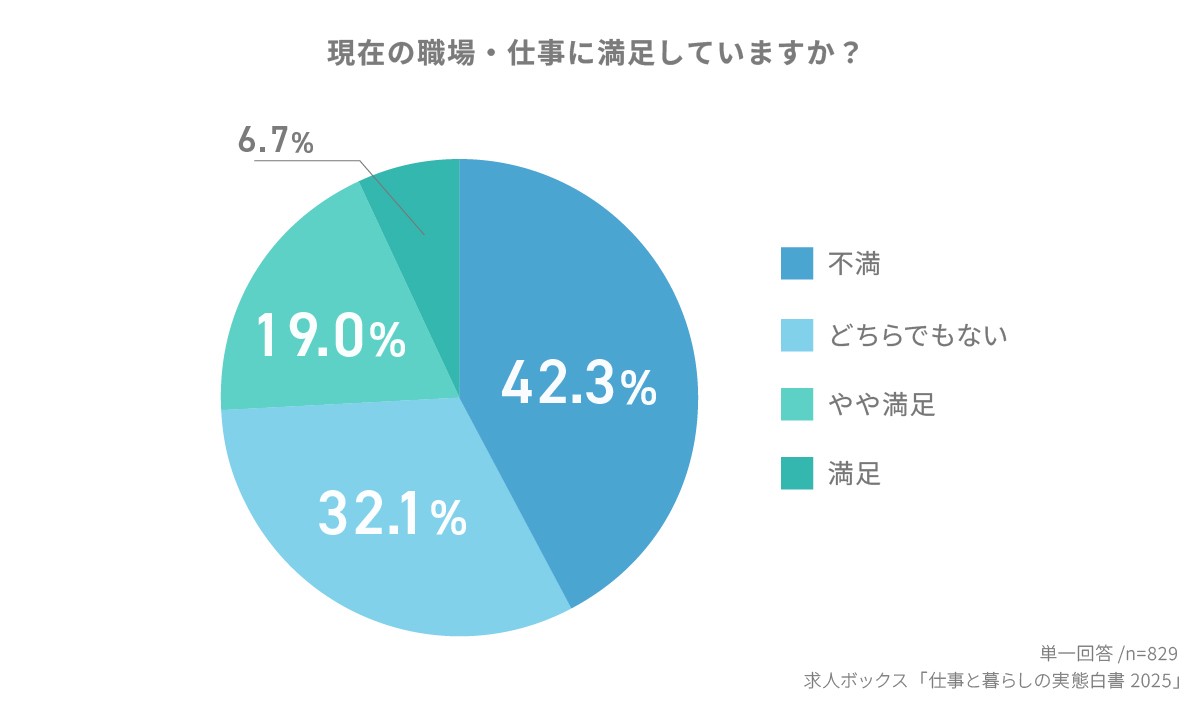 現在働いている人の「職場・仕事に対する満足度」を見ると、「不満」(42.3%)が最多となった。