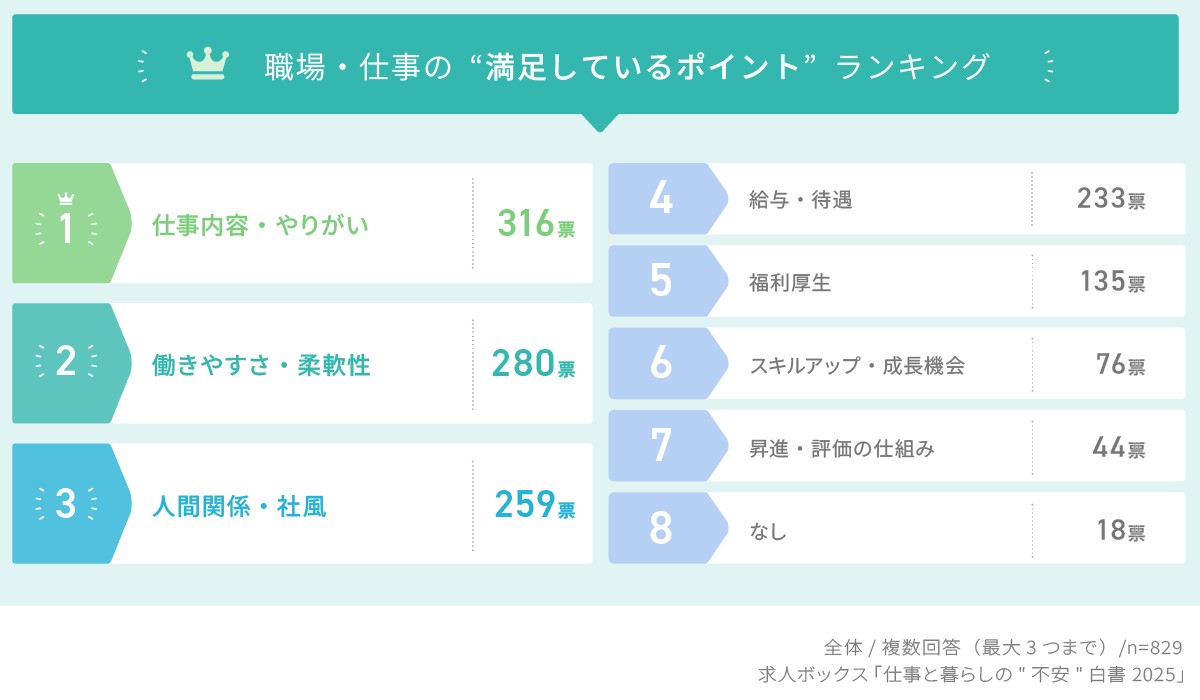 「職場・仕事のどの点に満足しているか」を見ると、「仕事内容・やりがい」(316票)、「働きやすさ(リモート・柔軟性)」(280票)、「人間関係・社風」(259票)が上位を占めた。