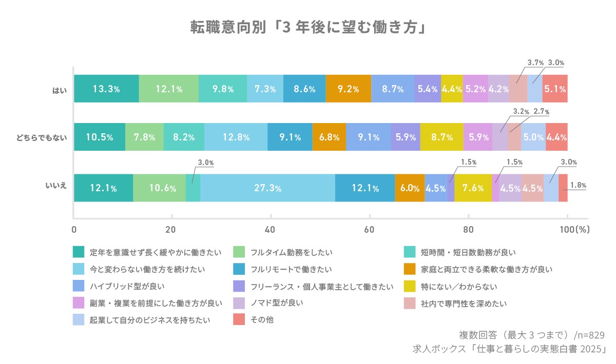 転職意向別で見ると、転職を考えていない層では「今と変わらない働き方を続けたい」(27.3%)が突出している。