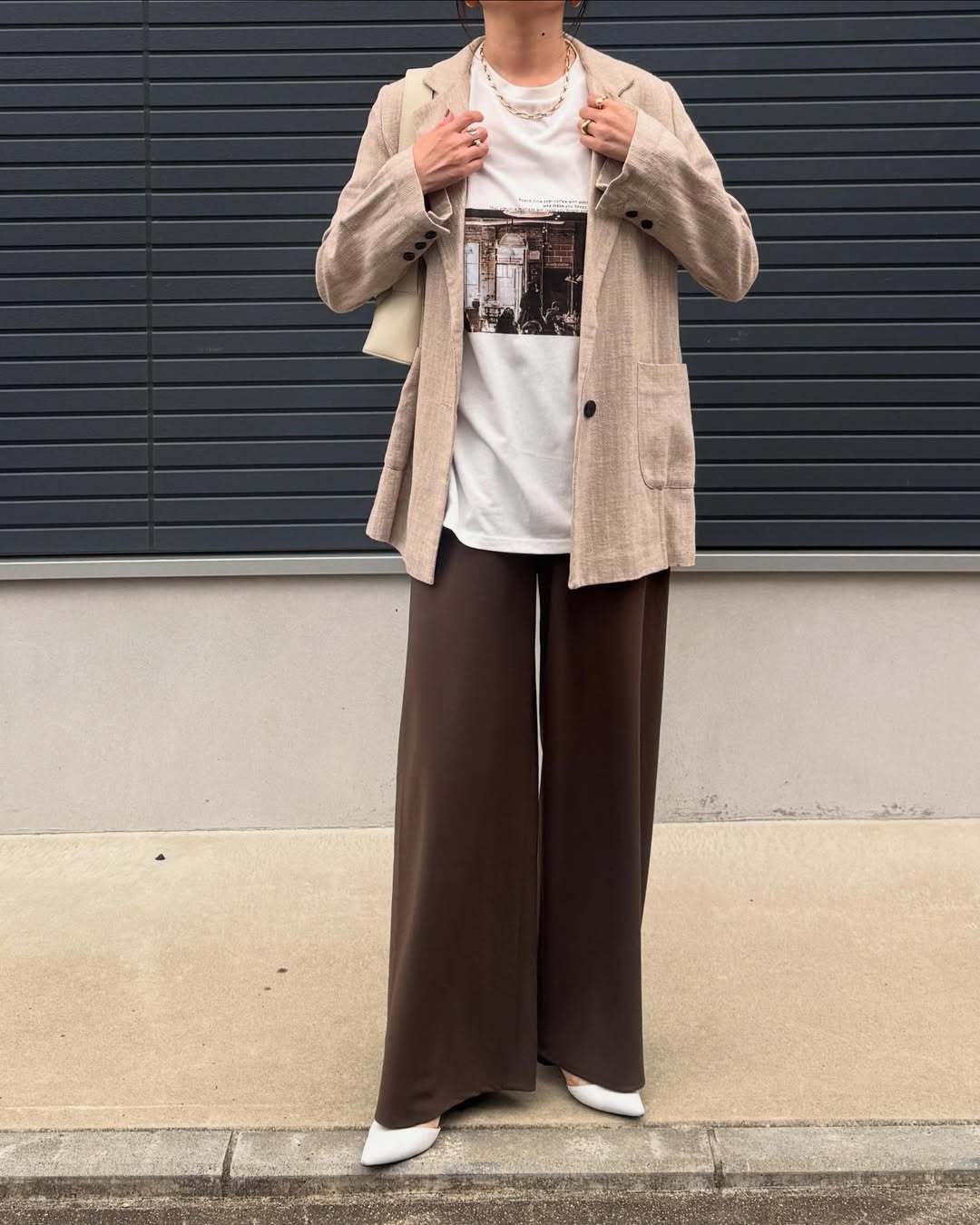 今年らしいトレンド感をまとうなら、ベージュのジャケットがおすすめです。