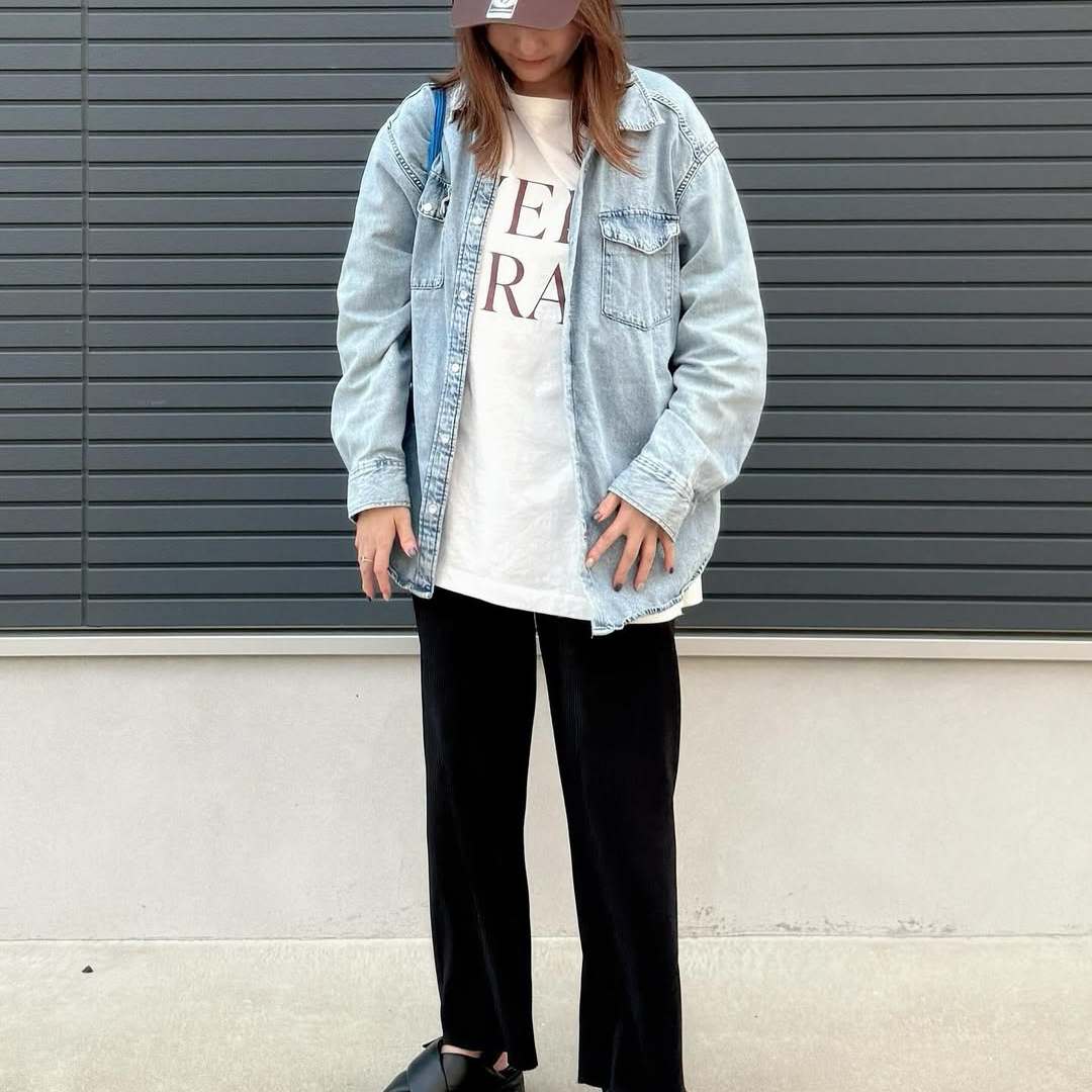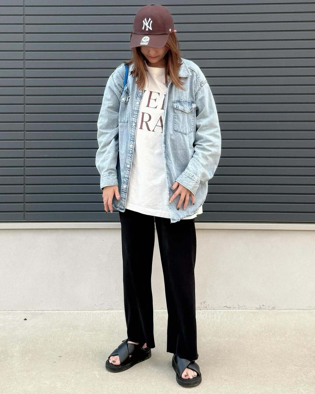 プリントTシャツに黒パンツを合わせたシンプルスタイルも、デニムを一枚プラスするだけで雰囲気が一変!