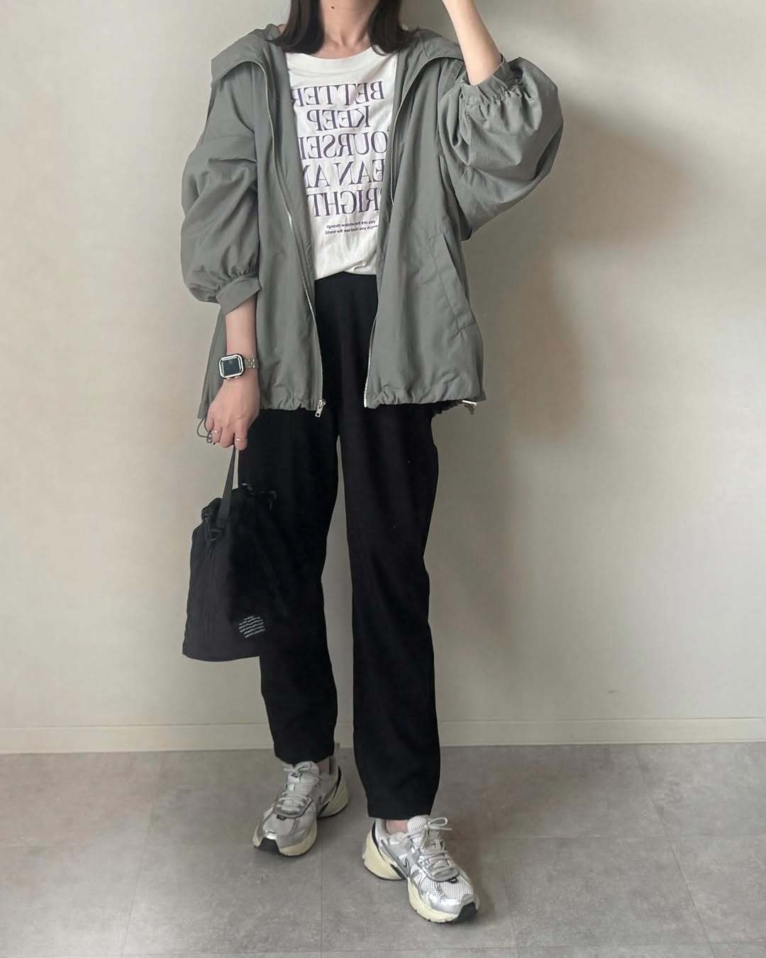 シンプルなモノトーンコーデに、ほどよいこなれ感を添えてくれるのがカーキのブルゾンです。