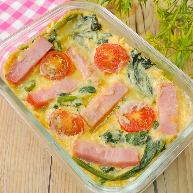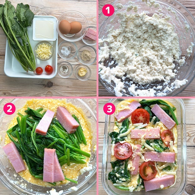 豆腐と卵を混ぜて、ほうれん草とベーコンとミニトマトを入れてレンジでチンするだけ。