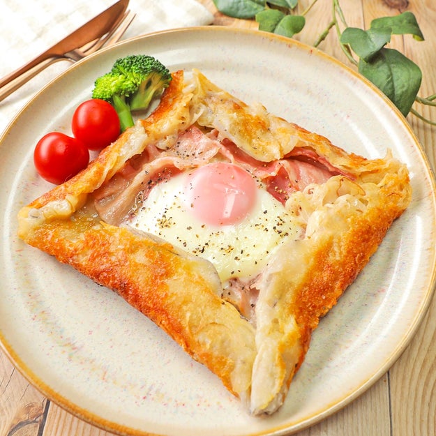 ③ ②にふたをして卵がお好みの固さになるまで焼く。ふたを取り、側面を折りたたんだら、完成!