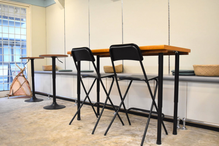前店舗はお土産屋さんだったそうで、陳列棚の棚板をテーブルにリノベーションしたり、棚の下に備わっていた収納スペースをベンチチェアとして活用したり、当時の面影があちこちに残っていました。