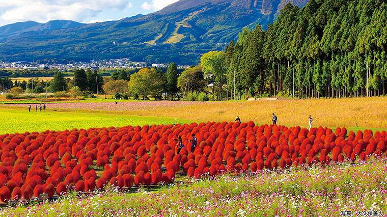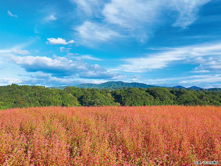 二本松市下川崎の東北(とうぎた)集落では5年前から遊休農地でヒマラヤ原産の赤そばを育て始めた。一面に広がるルビー色は、今や秋の訪れを告げる風物詩。2025年はコスモスの花も楽しめる。