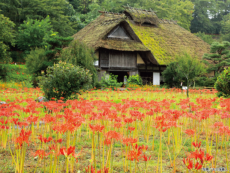 彼岸花とも呼ばれ、親しまれる曼珠沙華(まんじゅしゃげ)。『安達ヶ原ふるさと村』から阿武隈川沿いにかけて群生する曼珠沙華は地元の人が大切に育ててきた。燃えたつような赤と古民家の組み合わせには日本の原風景を感じる。