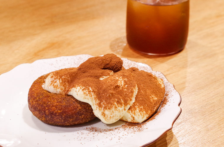 神戸店限定の『ティラミスドーナツ』は、揚げ立ての『プレーンドーナツ』に自家製ティラミスを合わせた贅沢な一品。ドーナツの深い香ばしさに、ティラミスのクリーミーな甘さが絡まり、1個でもしっかり満足感が得られます。