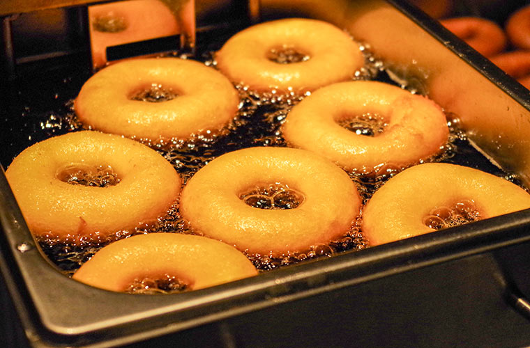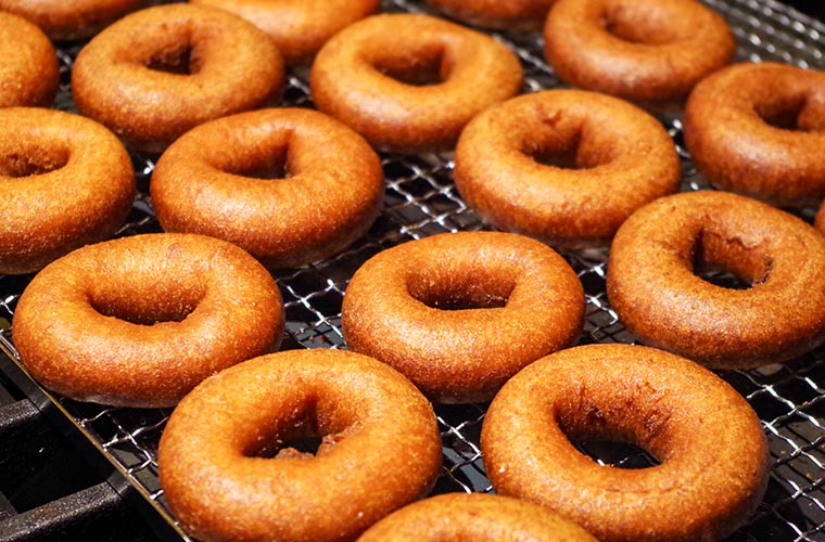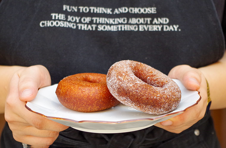 カウンターに腰かけると、目に入るのは次々と揚げられていくドーナツ。油がぴちぴちとはねる音や芳しい香りが食欲をそそります。