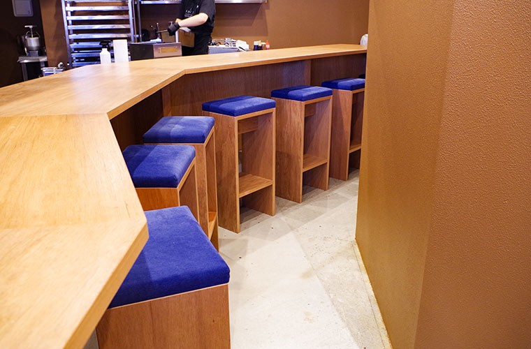 宝塚の本店で食べた「SHICT」のドーナツの味にほれ込んだ店主。「そのおいしさをもっと広めたい」と、人が集まる神戸への出店を決意したそう。「“ドーナツ屋“ではなく、おいしいスイーツと過ごす時間や空間を提供する“カフェ“でありたい」という思いから、神戸店には、ほかの店舗にはないカウンター席が置かれ、目の前でスイーツやドリンクができあがっていく過程も楽しめます。神戸らしいブルーを散りばめたインテリアも印象的で、落ち着いた上質なひとときを演出してくれます。