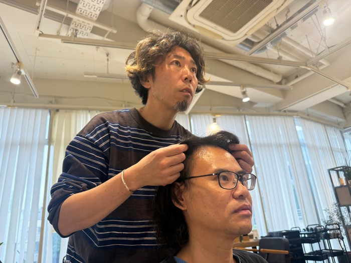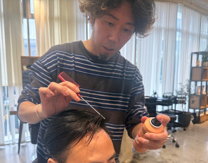 それゆえか、佐藤さんのカットをする手も慎重だ。刈り上げると薄さが目立ちそうなのでハサミでカットして刈り上げに見せるという謎のカットテクがサラッと駆使される。佐藤幸治もまたさすがであると言えよう。