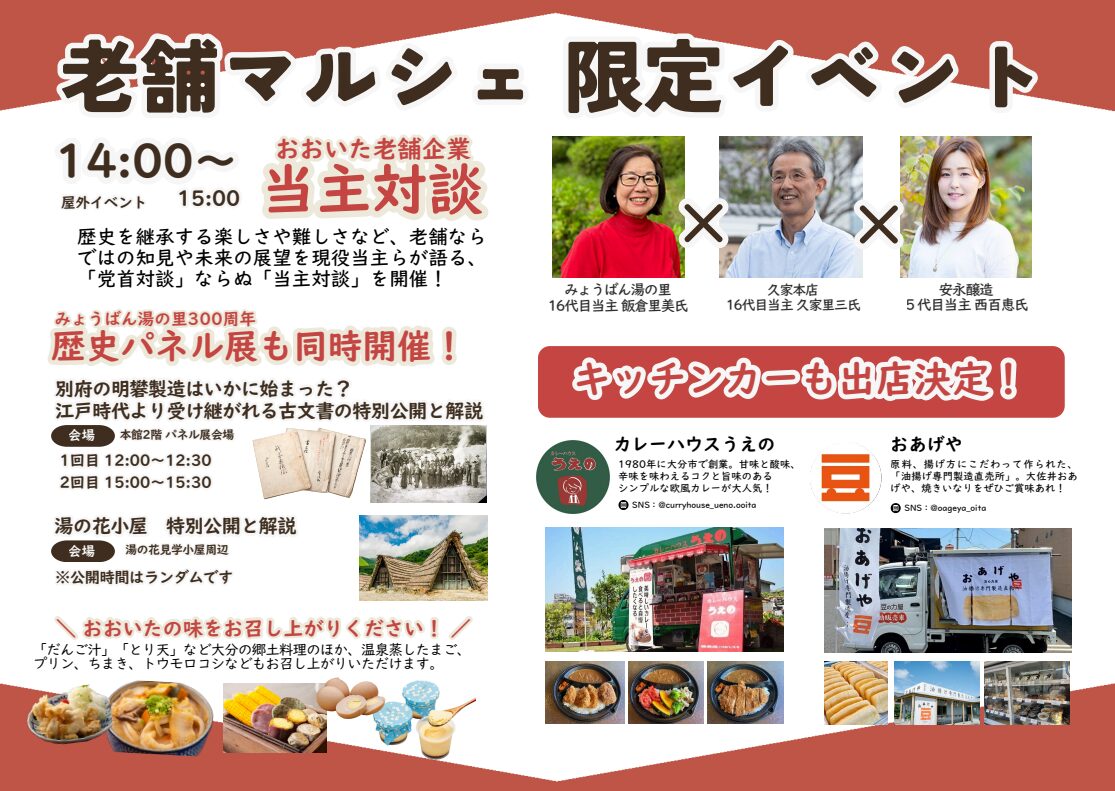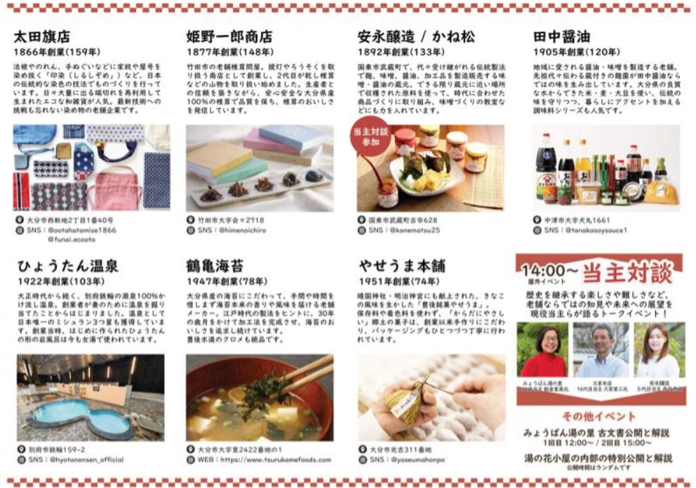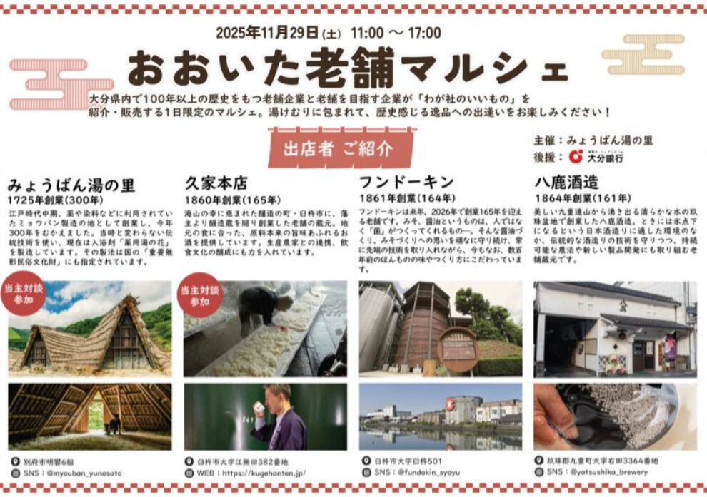 大分県内で創業100年以上の歴史を持つ老舗企業と老舗を目指す企業が大集結。お酒・味噌・醤油・銘菓など「わが社のいいもの」を紹介・販売する1日限定のマルシェです!「当主対談」や「湯の花小屋内部や古文書の特別公開」も予定されていますよ!キッチンカーの出店も決定!