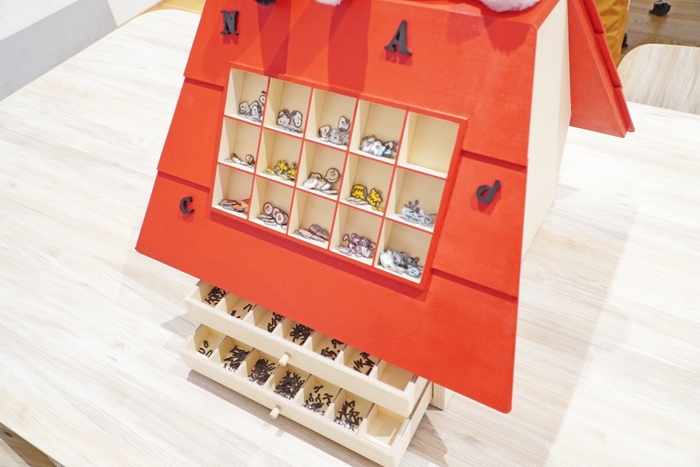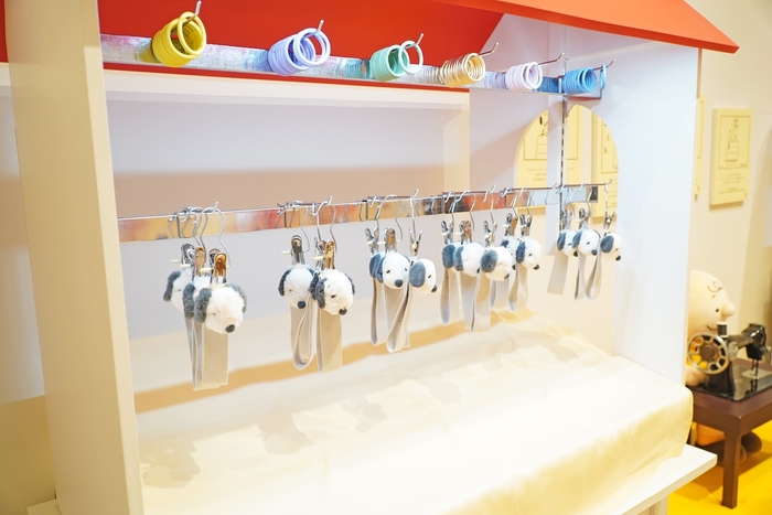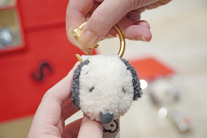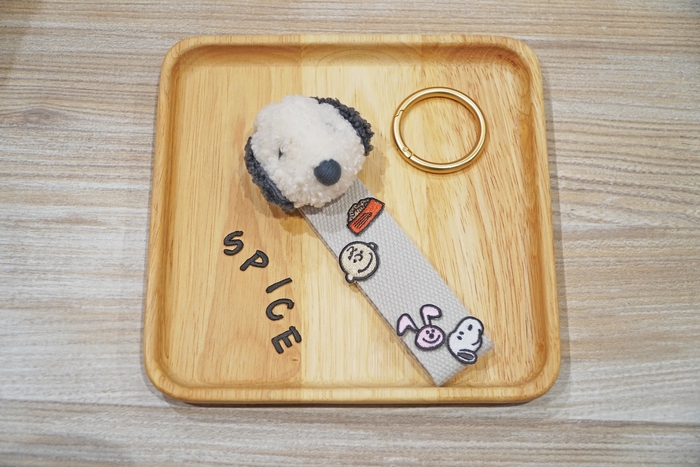作業自体もとてもカンタン。まずはカートから3種類のスヌーピー(ふわふわ・もこもこ・さらさら)からひとつ、6種類のリングから好きな色をチョイスし座席に着席。作業台に置かれている多数のワッペンを自由に組み合わせてタグ部分を装飾し、自分だけのオリジナルを作り上げる。