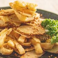 ② 小鍋に砂糖と水を入れて中火で熱し、きつね色になったら火を弱めて無塩バターを加えて溶かす。①を加えて全体に絡めるように炒める。フタをして10分程煮る。クッキングシートを敷いたパウンド型にりんごの丸い方を下にして並べる。
