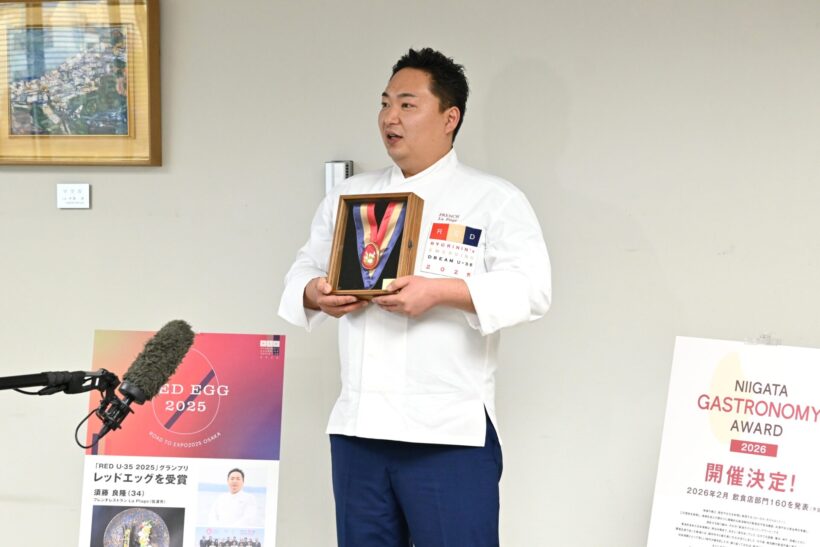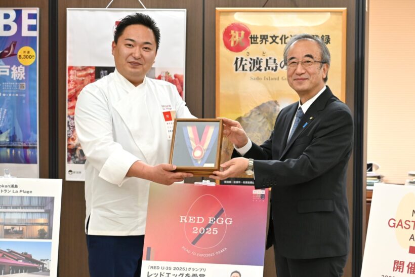 新潟県佐渡市のフレンチレストラン「La Plage(ラ・プラージュ)」を率いる須藤良隆シェフがこのほど、全国の若手料理人の才能を発掘する日本最大級の料理人コンペティション「RED U-35 2025」でグランプリとなる「レッドエッグ」に輝いた。須藤シェフは11月5日に新潟県庁を訪れ、新潟県の花角英世知事に受賞を報告した。