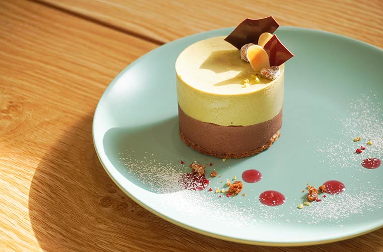 ローストナッツのキャラメリゼ、ピスタチオとショコラのムース、ピスタチオのムースを重ね、中に真っ赤なフランボワーズソースを隠した、見た目も味もアートなケーキ。濃厚なピスタチオの風味とクーベルチュールチョコレートのビターな香りに、フランボワーズソースの甘酸っぱさがアクセントに!舌の上にのせた瞬間、すーっと溶けるような極上の口溶けと共に、複雑なハーモニーを静かに味わってみて。