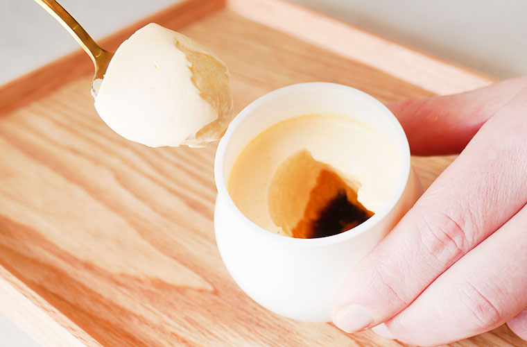 スプーンですくうと、とろっとした濃厚なプリンの中から香ばしいカラメルソースがあふれ出てくるのでご注目!生クリームや卵黄のコクを生かしたプリンは、カラメルのほろ苦さが加わることで、グッと味わい深くなります。ちょっぴりビターで大人な味わいは甘さがくどすぎず、何個でも食べたくなるおいしさです。