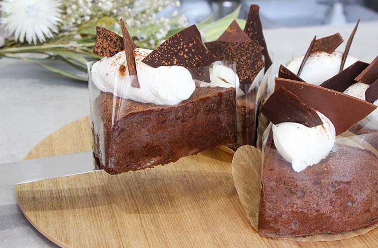 チョコ好きにぜひ食べてほしいのが『ガトーショコラ』。45%、60%、69%とカカオ分が異なる3種類のクーベルチュールチョコレートをブレンドし、粉を一切使わず、ほぼチョコレートだけで作った濃厚なケーキです。蒸し焼きでじっくりと火を通すことで、生チョコのようなまったりとした食感に仕上がるそう。生クリームの上にのった3枚のチョコは、ケーキの材料となっているクーベルチュールチョコレート。1枚ずつ味わって、カカオ分の違いによる果実感の強さや苦み、ミルク感を比べてみるのも楽しいですよ。
