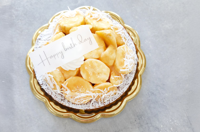 ホールケーキは3~5日前の完全予約制。風味豊かなタルトの上に、キャラメル風味のバナナの果肉をごろごろと積み重ねたデコレーションケーキは、通年提供している定番人気です。バナナ、キャラメル、ココナッツの三位一体を口の中で楽しんで♪