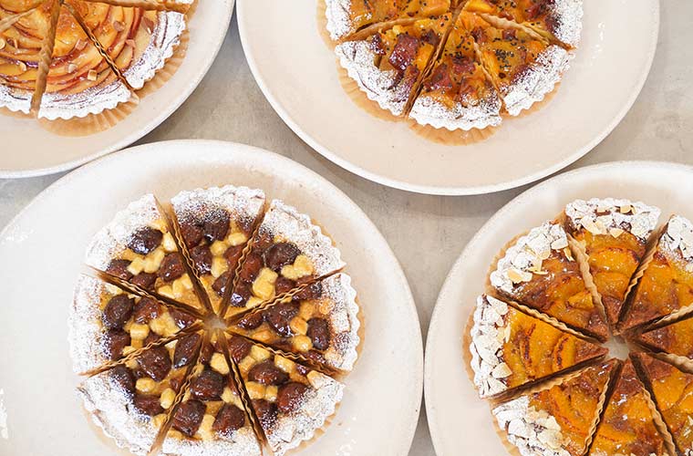 同店の焼きタルトは、フルーツをたっぷりトッピングして焼き込んだフルーティーな味わいが魅力。基本となるタルト生地は「よつ葉バター」をふんだんに使用。さらに厨房の温度や湿度管理から、こね方や焼成時間など細部に至るまで徹底し、芳醇さとサクサク感が自慢です。