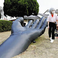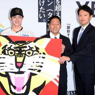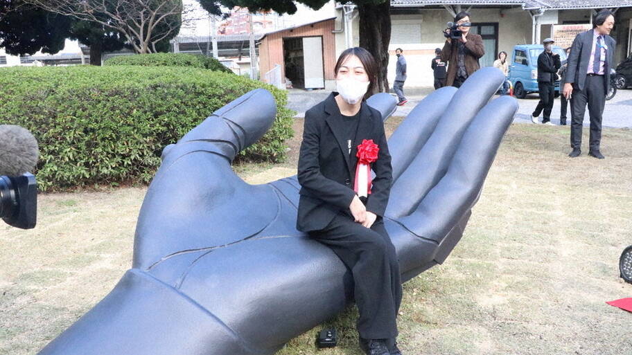 続いて、特別に制作されたオリジナルヘッドマークがお披露目。SLに乗ったターフィーの可愛らしいイラストが描かれたデザインで、実際の掲出はないがウインズ小郡館内で年内一杯展示される予定だ。ヘッドマークをアンヴェールした村重は、「ターフィーくんの帽子のところにフグがいて何回も見ちゃいます。かわいいデザインです」とひと目見て気に入った様子。