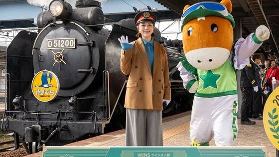 イベントは、今年で20周年を迎えた「JRAウインズ小郡」(JR新山口駅から車で約10分)と、新山口駅-津和野駅間を走る「SLやまぐち号」がコラボして開催したもの。JRAマスコットキャラクター「ウインズ小郡ご当地ターフィー」のモチーフの一つがSLであることがきっかけとなり、今回の企画が実現した。