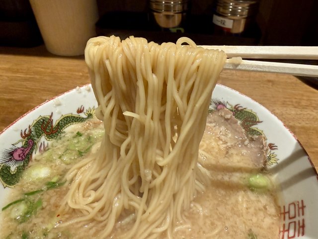しなやかで伸びのある中細麺は、ほどよいコシと弾力があり、油分を媒介にスープがよく絡みます。