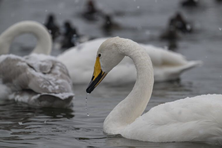 多い年で約250羽ほど飛来する白鳥は、近所の人たちの恵みを受けて大切に保護されています。