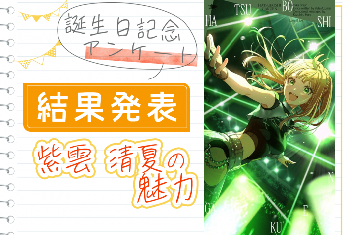 アニメイトタイムズでは、これを記念してアンケートを実施。清夏の魅力を「キャラクターデザイン」「キャラクターの性格」「キャラクターボイス(声優)」「他キャラクターとの関係性」「好きな音楽がある」にカテゴライズし、プロデューサーおよびファンの声を募集しました。