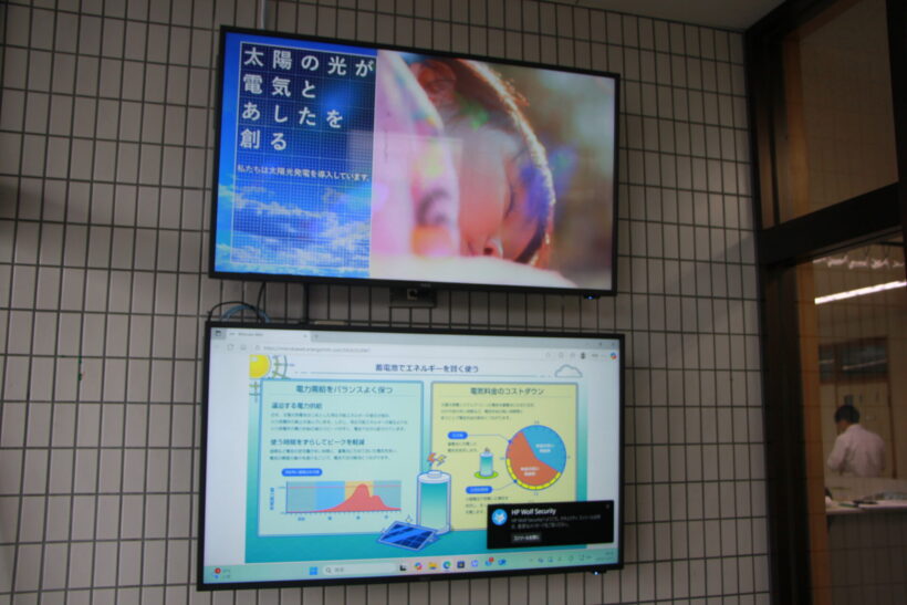 事務所のエントランスにはリアルタイムで発電状況を伝えるディスプレイが掲示されている