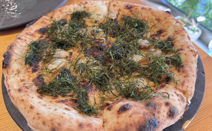 「こなPizza」という名前のピザなのですが、生地の上にたっぷりの「こな」という海藻が乗っているという変わり種。ミスマッチなのではないかと思いましたが、食べてみると磯の香りともちっとしたピザ生地が非常によくマッチしており、オリーブオイルが食感をうまくまとめていて非常に美味しかったのです。